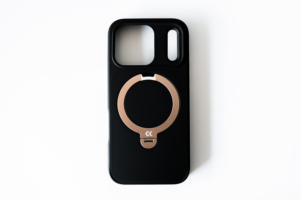 ケース本体で、まず目を惹くのが中央に設置された金色のリングスタンドです。